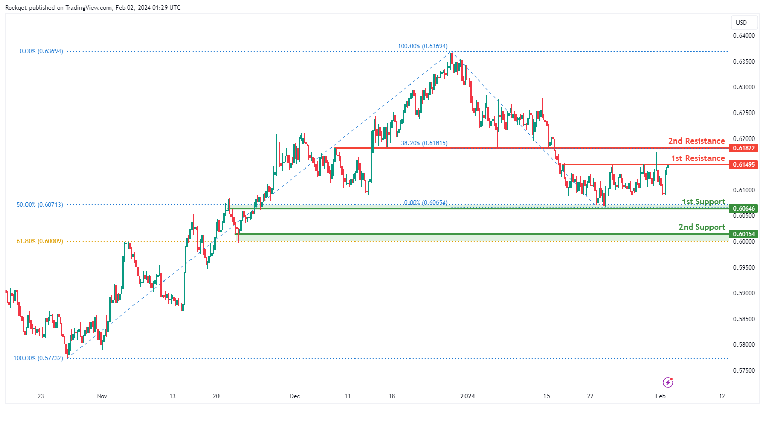 第一个阻力位0.6149被确定为回调阻力位。向上看,第二个阻力位0.6182被标记为与38.20%斐波那契回撤位一致的重叠阻力位,进一步突出了其作为潜在阻力点的重要性。