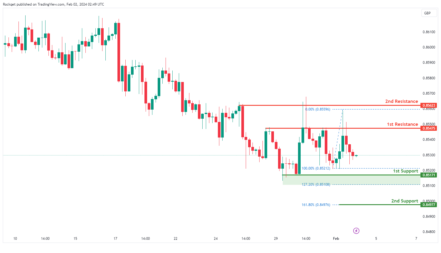 第二个阻力位0.85623被认为是另一个回调阻力位,暗示价格波动的潜在上限。
