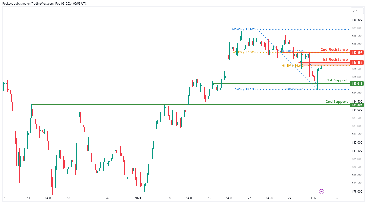 第二个阻力位187.497也被认为是重叠阻力位,与61.80%斐波那契回撤位一致,进一步增加了重要性。
