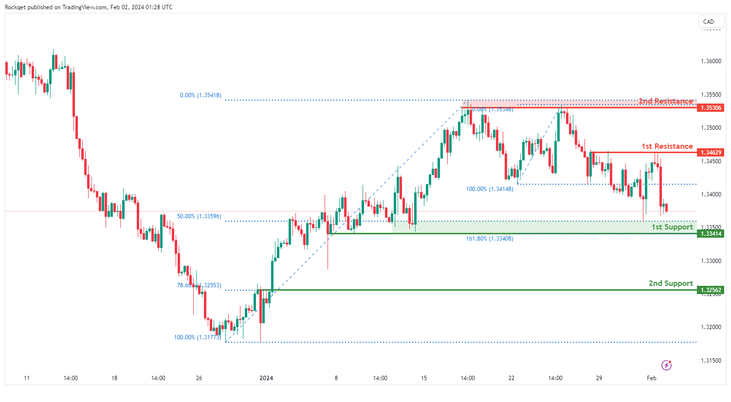 在阻力位方面,第一个阻力位1.3462被确定为回调阻力位。向上看,第二个阻力位1.3530被认为是一个多波段高位阻力位,进一步突出了其作为潜在阻力位的重要性。