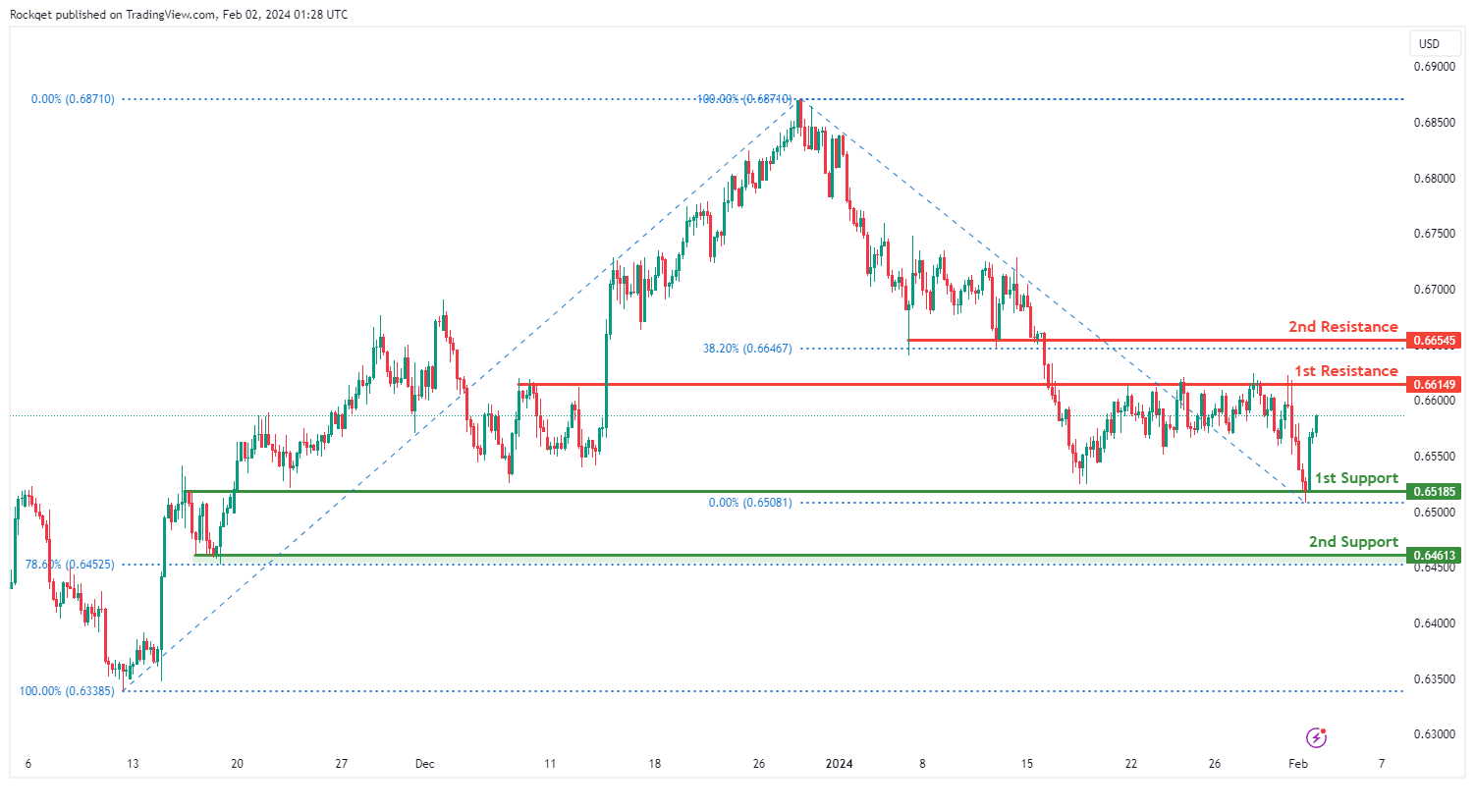 第一个阻力位0.6614被确定为回调阻力位。向上看,第二个阻力位0.6654也为回调阻力位,与38.20%斐波那契回撤位一致,进一步突出了其作为潜在阻力位的重要性。