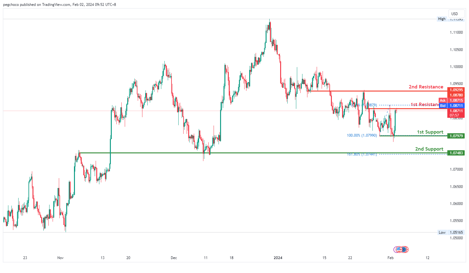 第二个支撑位在1.0748,为重叠支撑位,由于161.80%斐波那契延伸位的存在而得到加强,进一步加强了其作为潜在支撑区的重要性。