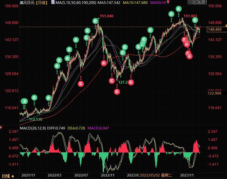 美元/日元仍持于日线云区和关键的费波纳奇回档位149.17之间。日线云区目前位于143.58-146.10区域。