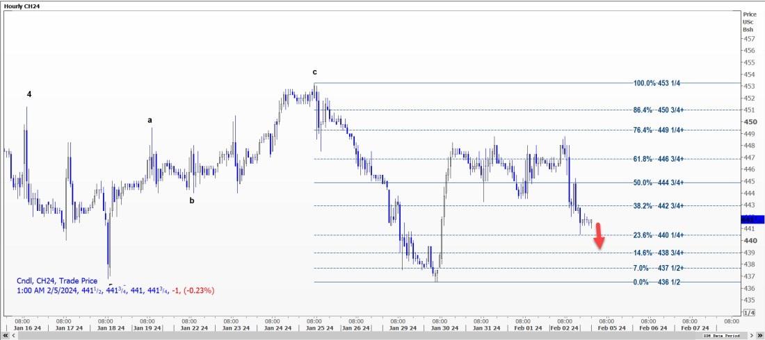 CBOT玉米可能跌至4.3650-4.3875美元区间CBOT 3月玉米CH24可能突破每蒲式耳4.4025美元的支撑位,并跌至4.3650-4.3875美元的区间。