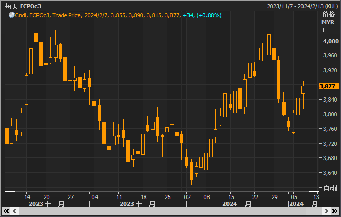 马来西亚衍生品交易所4月份交割的基准棕榈油合约FCPOc3上涨3-4林吉特,涨幅0.88%,至3,877林吉特(814.67美元)。