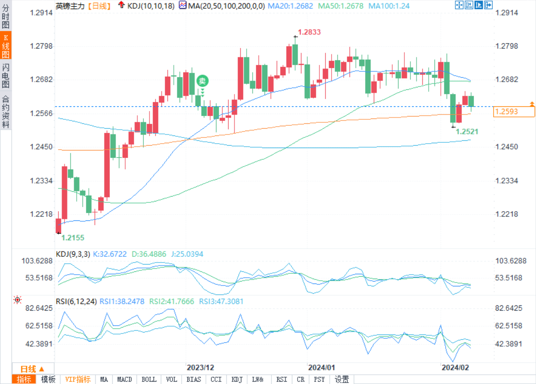 北京时间23:12,英镑主力报1.2600,跌幅0.25%。