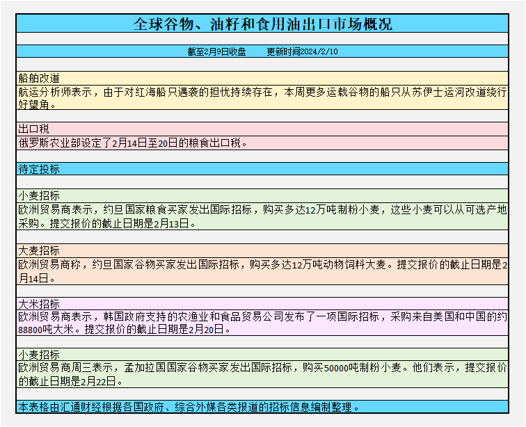 截至周五收盘,全球谷物、油籽和食用油出口市场概况: