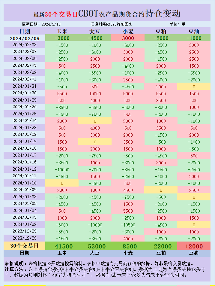 根据汇通财经观察,海外交易商估算的结果显示,本周五(2月9日),大宗商品基金增加CBOT小麦投机性净多头,增加大豆、豆粕、玉米、豆油投机性净空头头寸。最新30个交易日,大宗商品基金增加CBOT豆粕、大豆、玉米、小麦投机性净空头头寸、增加CBOT豆油投机性净多头头寸。