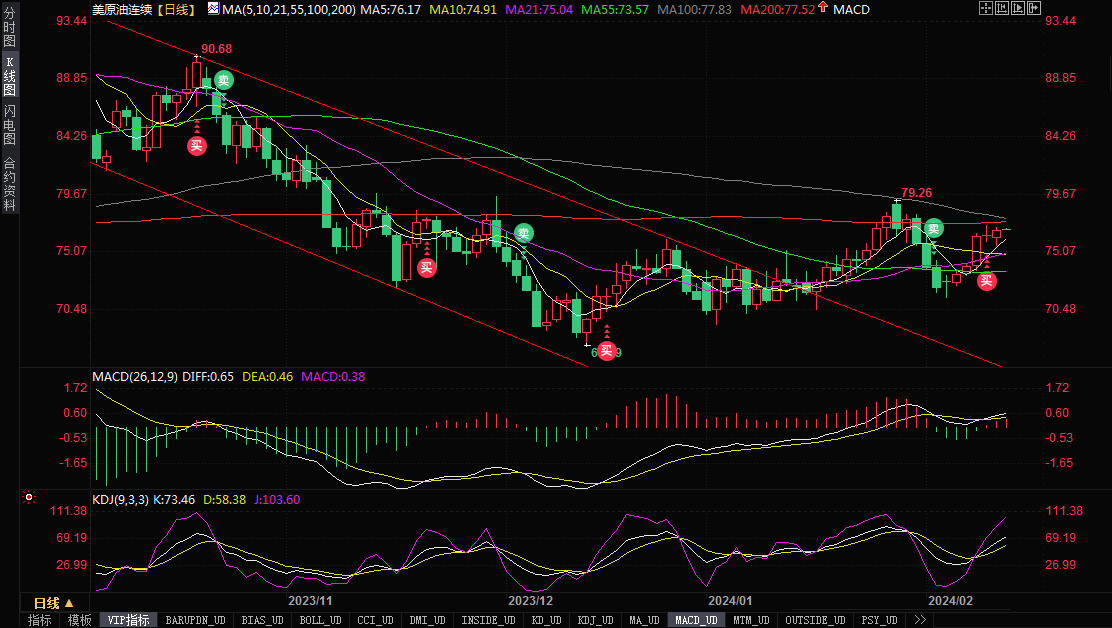 美原油目前交投于76.90美元/桶附近;对利率和全球需求的担忧一度令油价周一盘中下跌逾1%,但随后扭转跌势,中东紧张局势可能导致供应问题继续支撑油价。
