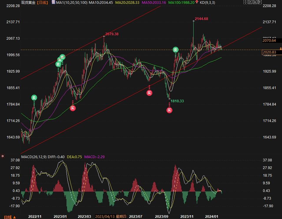 黄金价格已跌破2023美元/盎司的关键支撑位,预示着新的下跌趋势即将展开,目标直指2000美元/盎司大关。在此过程中,2010美元/盎司的整数关口将考验黄金看涨阵营的承诺。