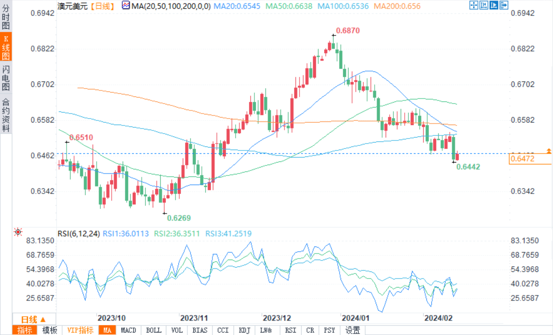 澳元兑美元跌至三个月来的最低水平0.6453美元,跌破关键支撑位0.6469美元。