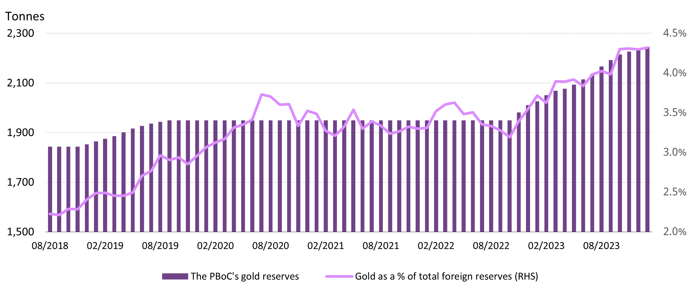 中国黄金市场1月份批发黄金需求猛增,官方黄金储备也进一步增加。