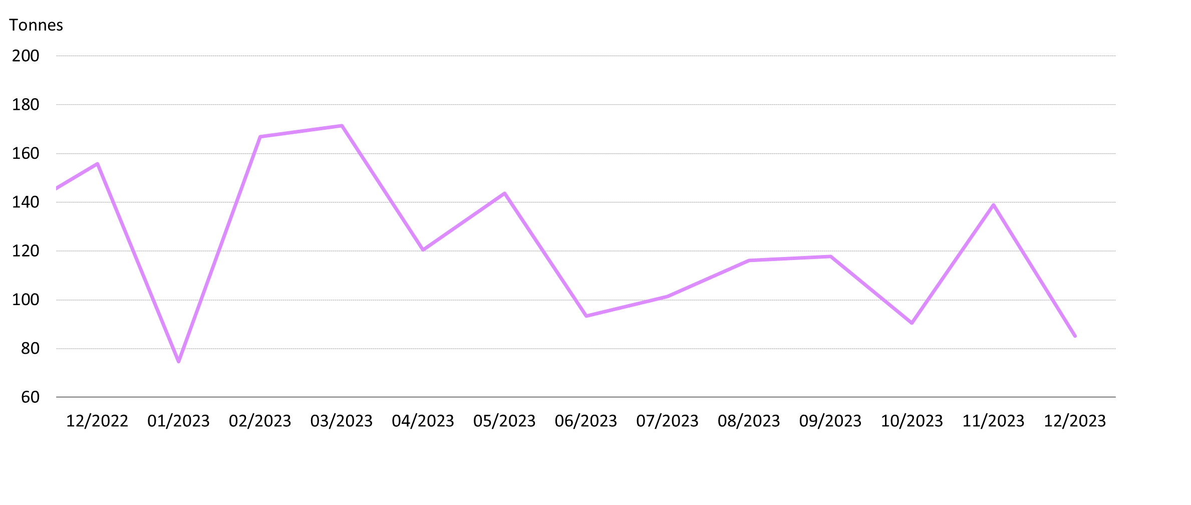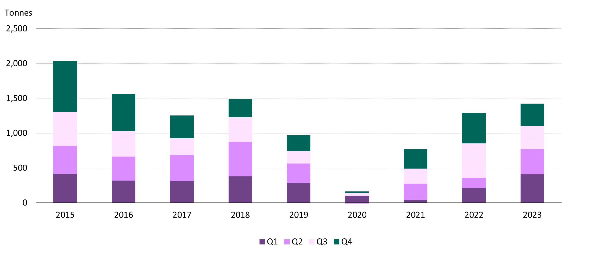 2023年,中国净进口黄金1,420吨,同比反弹10%。总体而言,2023年中国黄金进口量的变化反映了当地黄金需求的变化,黄金需求同比反弹15%。与此同时,与新冠病毒相关的限制的放松导致国际航班大幅反弹,这是另一个关键因素。