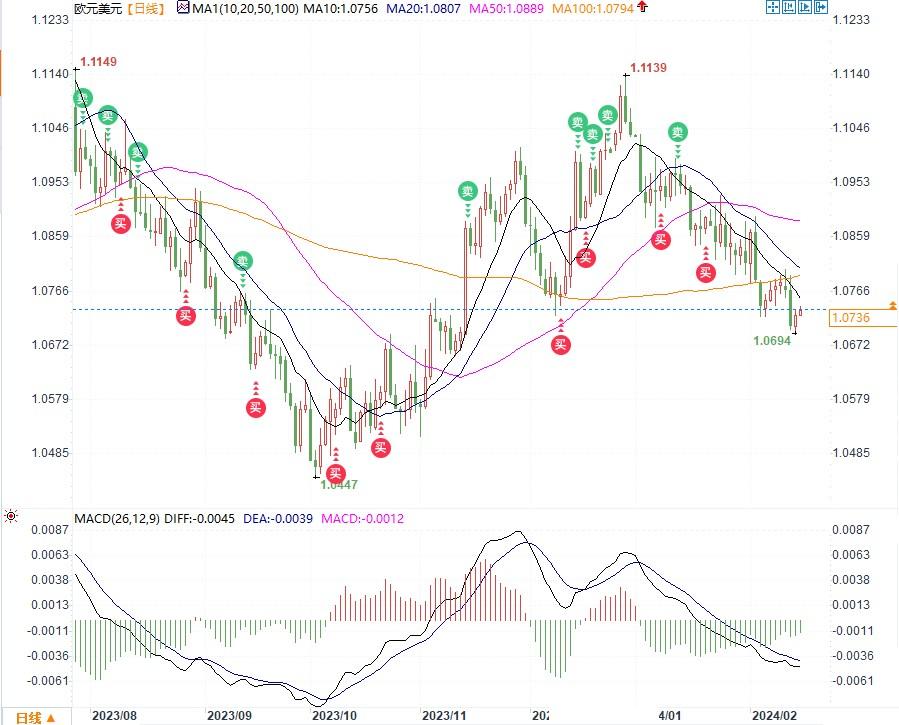 综合技术指标分析,欧元/美元的整体趋势在1.07440下方呈现看跌态势,需密切关注动能潜在变化。