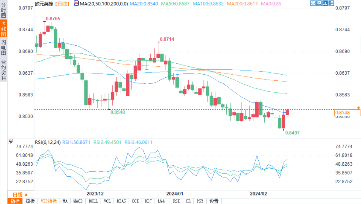 自2023年12月下旬以来,欧元/英镑一直处于持续下跌趋势中,在整个走势中创造了较低高点和较低低点,导致英镑从峰值到低谷暴跌了约2.5%。本周,该货币对跌至近六个月来的最低点,随后在0.8500左右的关键技术底部反弹后小幅回升。