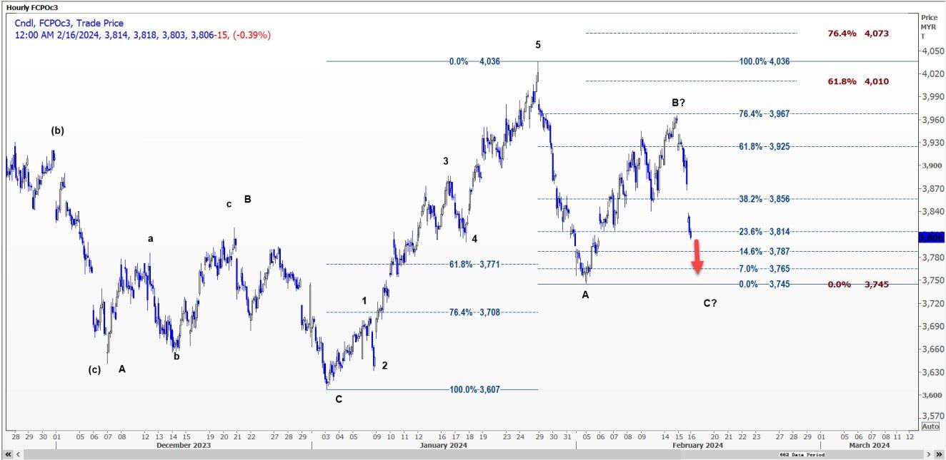 对5月合约FCPOK24的图表进行研究,发现3807-3810林吉特的支撑区域已或多或少被打破。此次突破打开了通往3773林吉特的道路。