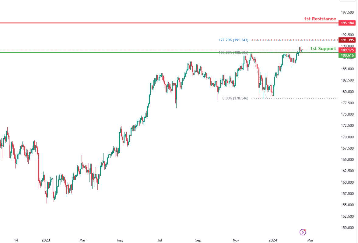 在阻力位方面,第一个阻力位195.184与多波段高阻力位一致。这一水平是抛售压力一直很强的历史点,可能成为进一步上涨的障碍。