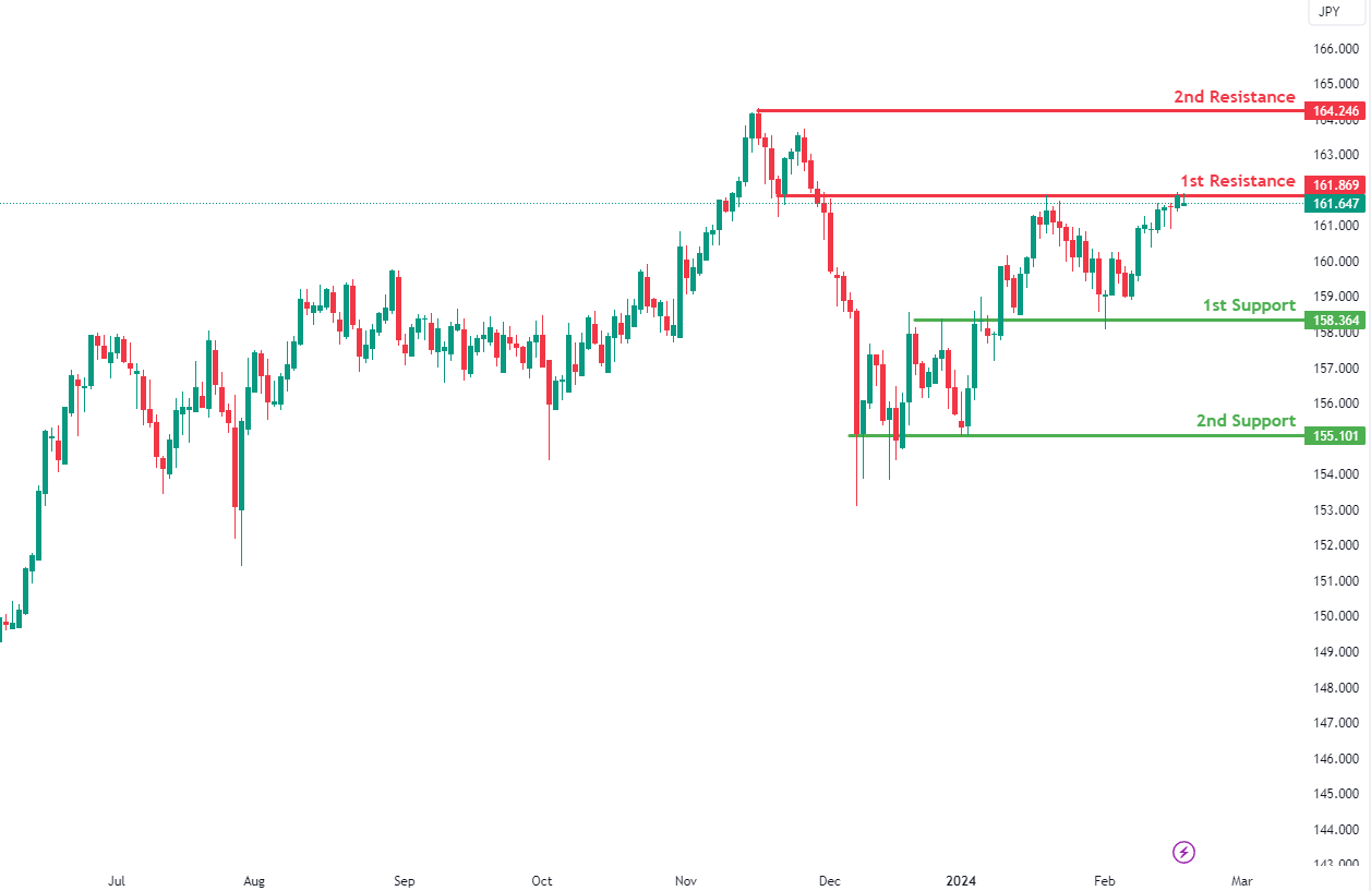 第一个支撑位158.364很重要,它与重叠支撑位大致重合。这一水平代表了此前买入兴趣出现的历史点,起到支撑作用。