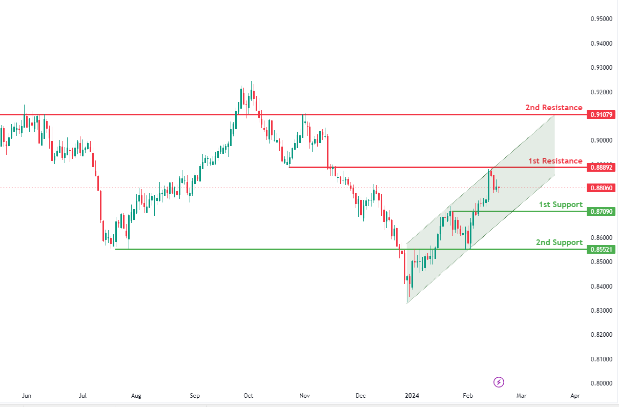 在阻力位方面,第一个阻力位位于0.8889,确定为重叠阻力位。这个水平可能作为一个障碍,抛售压力可能会增加,如果接近,可能会导致价格回调。