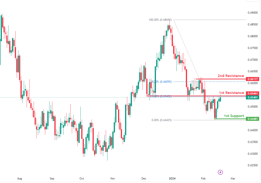 第一个阻力位0.6546为与23.60%斐波那契回撤位一致的重叠阻力位。在此之上,第二个阻力位0.6617为回调阻力位,该阻力位与38.20%斐波那契回撤位一致,进一步突出了其作为潜在阻力位的重要性。