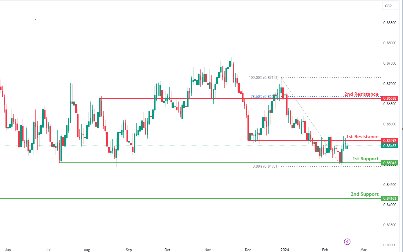 第二个支撑位在0.8552,为重叠支撑位。这个水平为潜在的购买兴趣提供了进一步的强化,并作为价格可能找到支撑的额外区域。