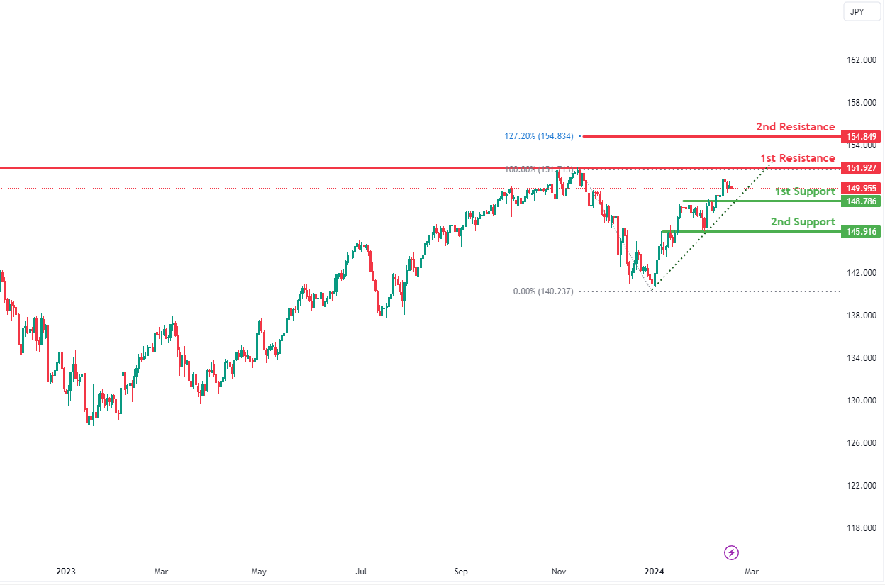 在阻力位方面,第一个阻力位位于151.92,是一个多波段高阻力位。这个水平可能作为一个障碍,抛售压力可能会增加。如果接近这一水平,可能会导致看涨趋势暂停或逆转。