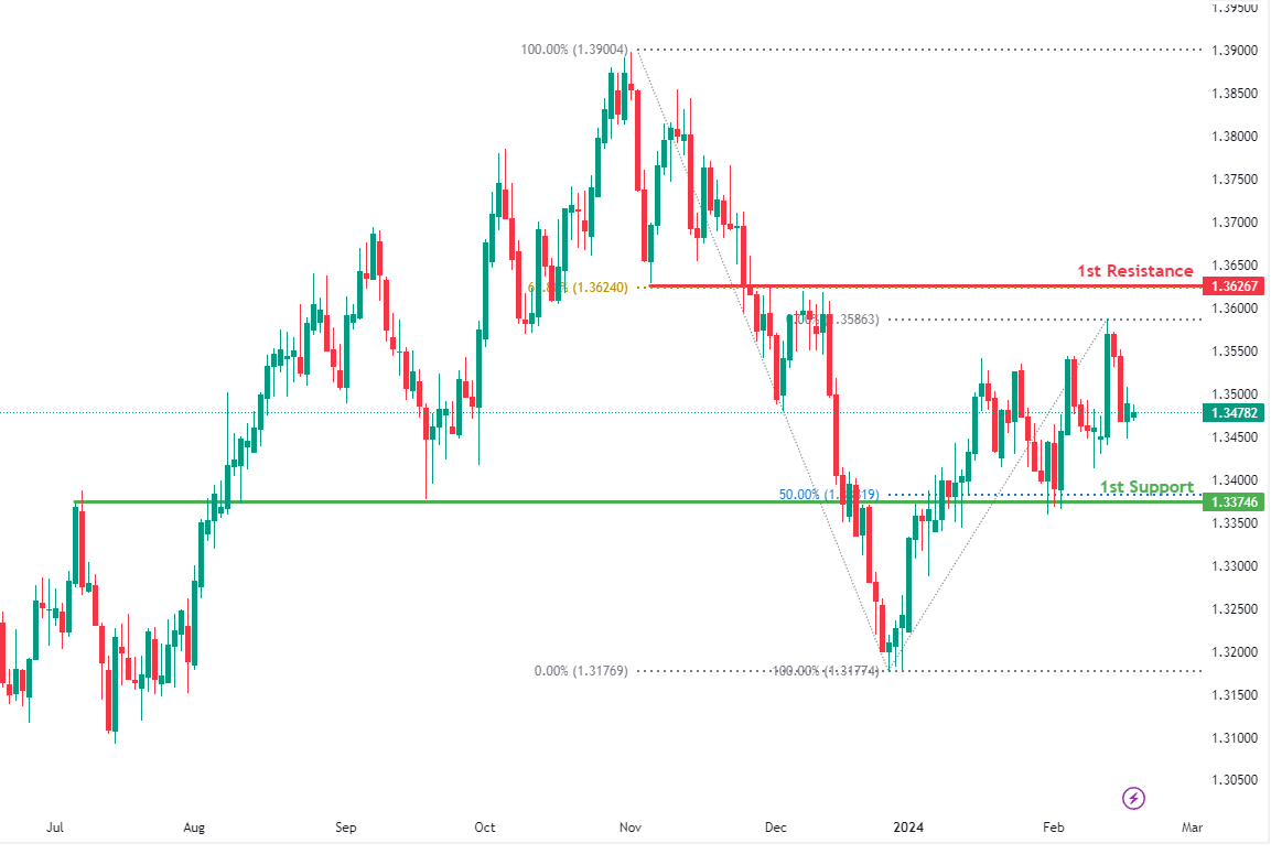 上行方面,第一个阻力位1.3626是与61.80%斐波那契回撤位重合的重叠阻力位,进一步突出了其作为潜在阻力位的重要性。