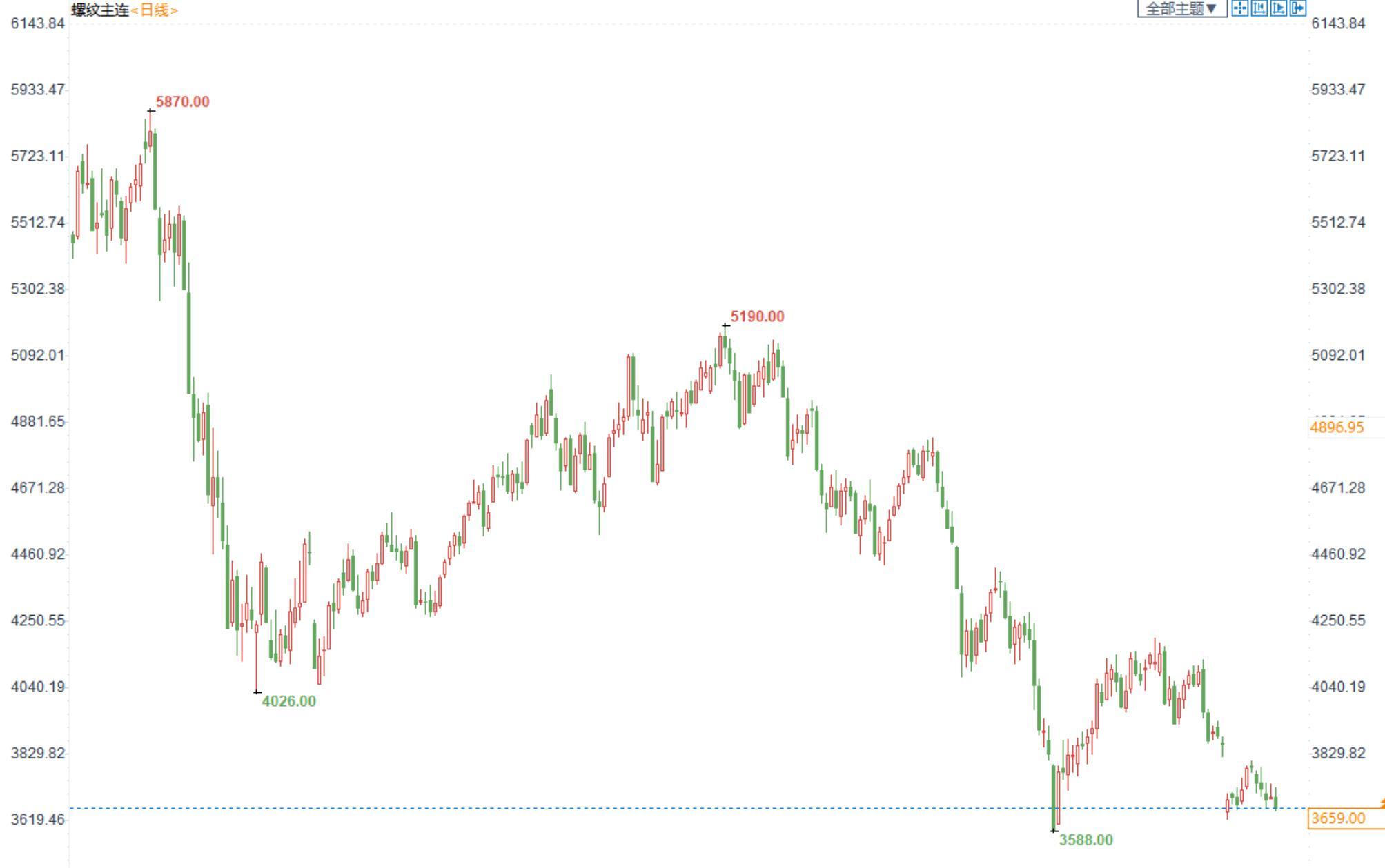 价格:螺纹钢2301合约白天持续震荡,午后迅速走低,一度跌至近10天低位3650,收盘为3659元/吨,收跌1.48%。