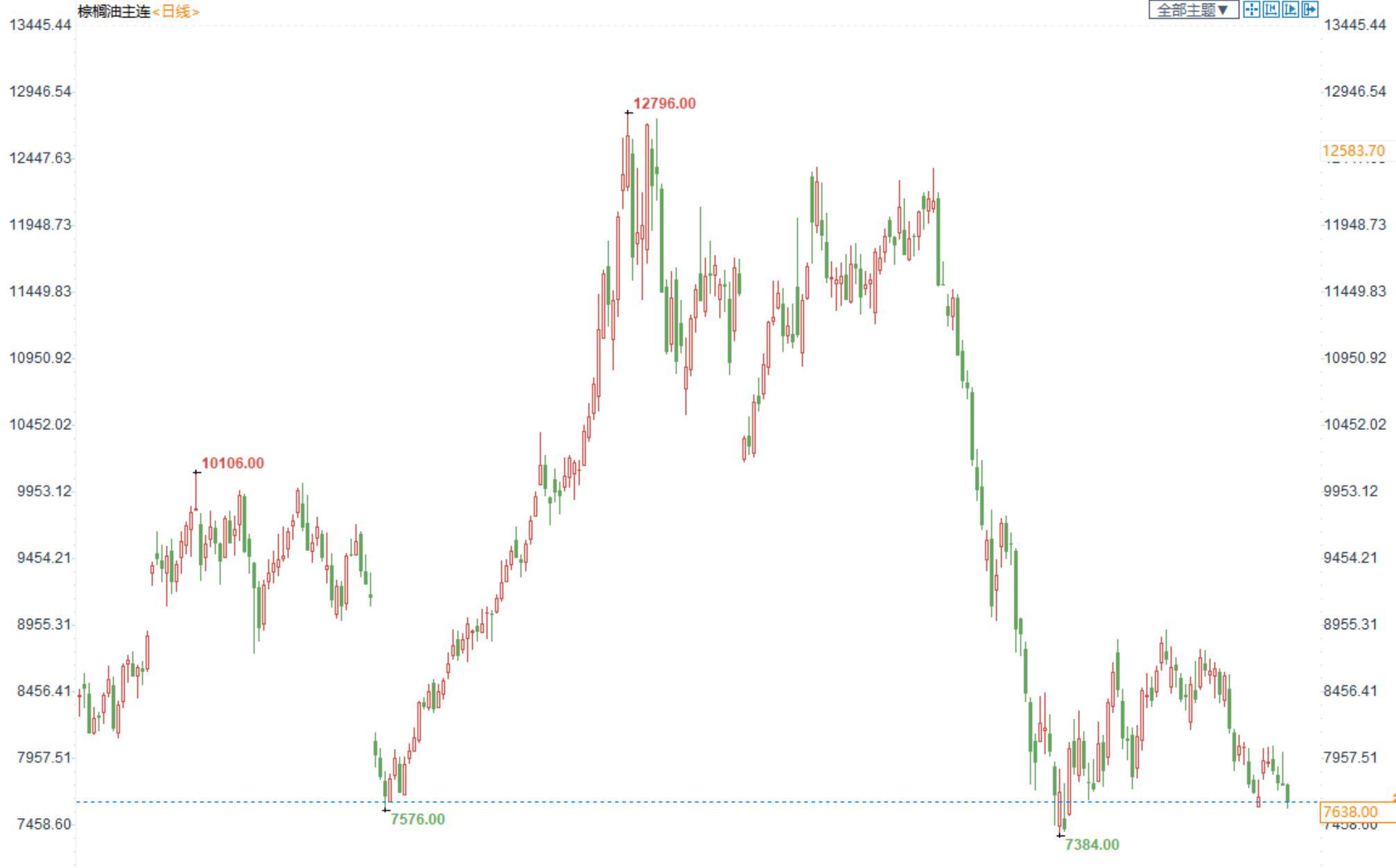 棕榈油2301合约日内跌1.65%,收盘7638元/吨;广州市场棕榈油7940元/吨。