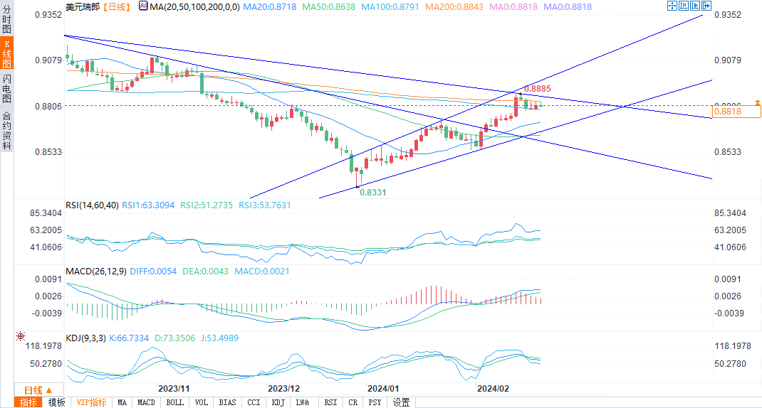 标题:美元兑瑞郎短期上涨前景脆弱,长期阻力0.8888等待突破