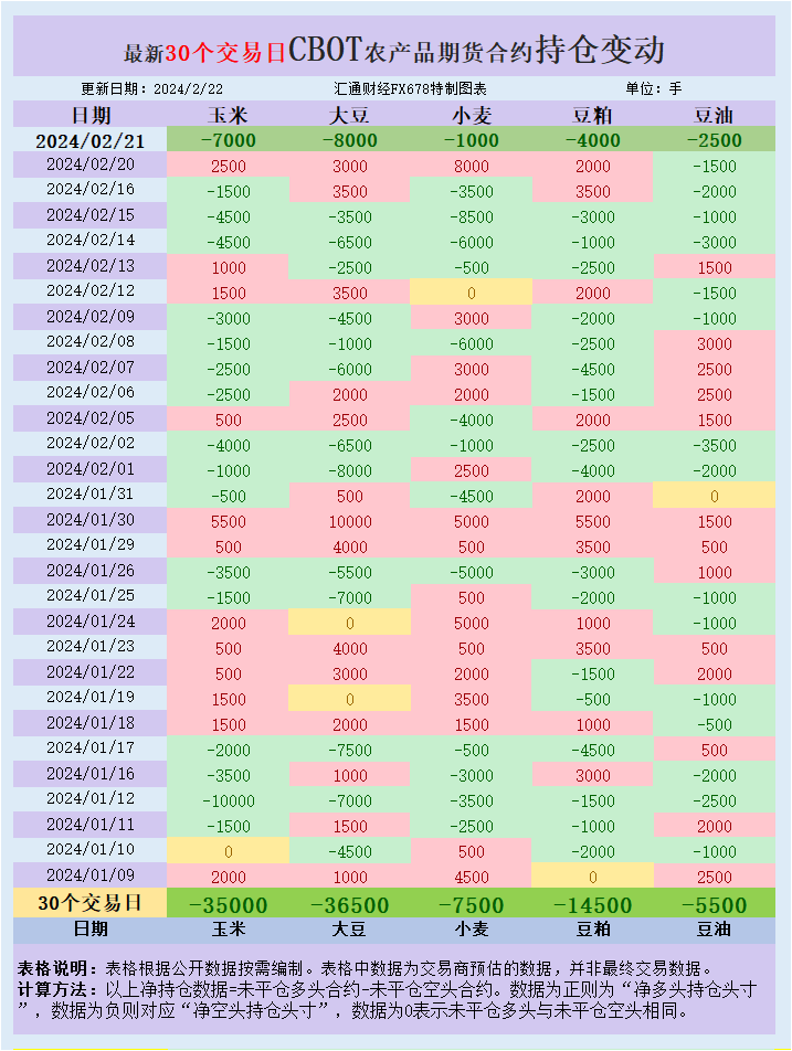 根据汇通财经观察,海外交易商估算的结果显示,本周三(2月20日),大宗商品基金增加CBOT玉米、小麦、大豆、豆粕、豆油投机性净空头头寸,增加投机性净多头头寸。最新30个交易日,大宗商品基金增加CBOT豆粕、大豆、玉米、小麦、豆油投机性净空头头寸。