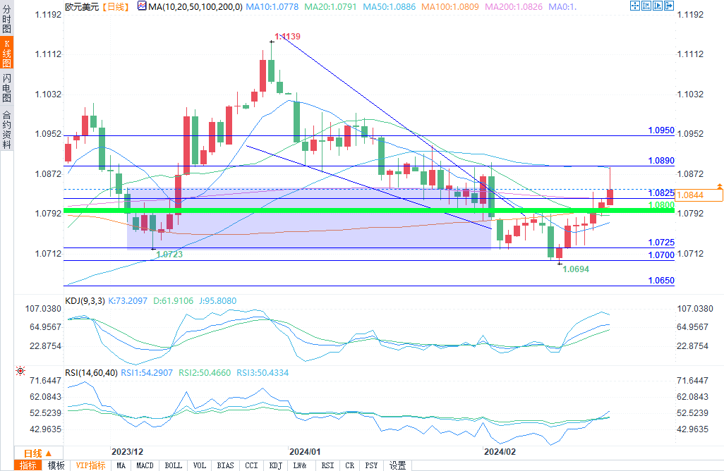 欧元兑美元在12月低点1.0723下方开始回升,最高反弹至接近2月初的1.0890水平。从最低点开始,