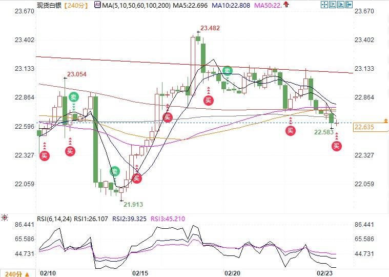 现货白银日内走低0.41%,交投于22.636美元/盎司附近。周四公布的初请失业金数据下降,且美国2月制造业PMI超出预期,进一步推迟了对美联储本周期第一次降息时间的预期。本文为黄金、白银技术分析。