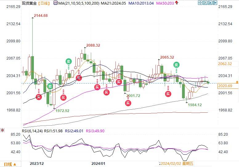 金价未能守住50日移动均线2023,金价可能会再次跌向2004美元/盎司。在此之前,金价周二触及的低点2015美元/盎司可能提供一些支撑。