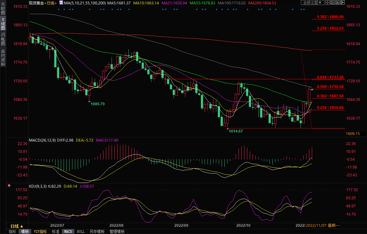 现货黄金窄幅震荡,目前交投于1708美元/盎司附近,守住了隔夜大部分涨势。周二纽约时段,金价顶破1680关口后快速拉升,最高触及1716.79美元/盎司,为10月7日以来新高,也是100日均线阻力所在,一方面,上周美联储利率决议后,市场预计美联储将放缓加息步伐,