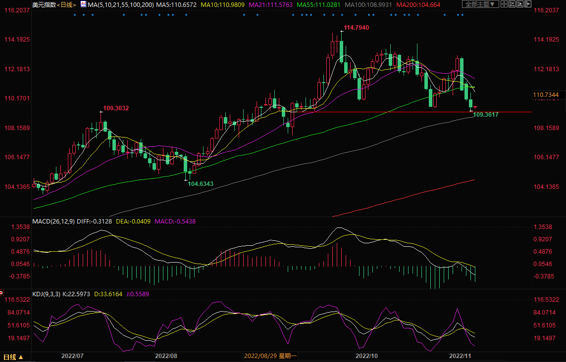 周二美元指数下跌0.5%,盘中最低触及109.36,为9月20日以来新低,也是连续三个交易日下跌,目前市场关于美联储政策迎来拐点的预期持续升温,令美元面临进一步回调风险,有望给金价提供进一步冲高机会。