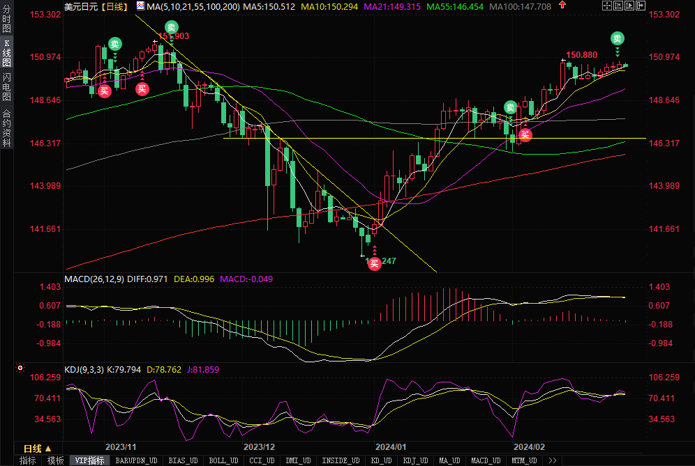美元/日元重返151关口,将支撑其升至151.889阻力位。