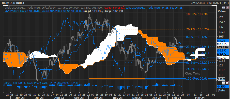 美元指数最终可能会跌破费波纳奇回档位103.304,这是100.610-104.970(12月至2月)升幅的38.2%回档位。美元指数可能会下滑,因为周四在下方的102.60附近存在“云带变色”,通常会产生吸引力。