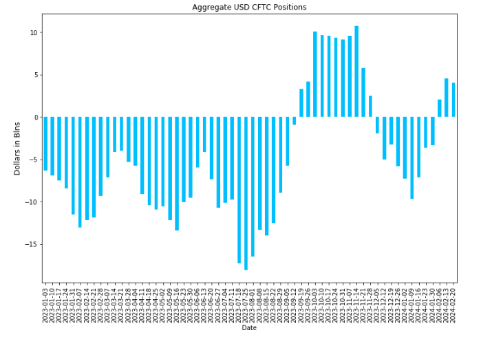 截至2月20日当周,美元投机性多仓从一周前的45.5亿美元小幅缩减至40.6亿美元。这部分多仓来自于芝加哥国际货币市场(IMM)投机客的欧元、日元、英镑、瑞郎、加元和澳元净合约仓位。