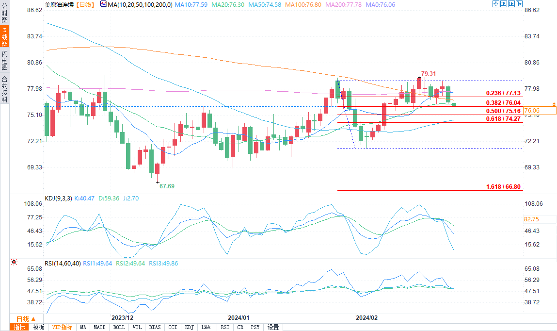 汇通财经APP讯——周一(2月26日),WTI油价在周一早盘进一步下跌,延续了上周五2.2%的跌幅。有信号显示,美国通胀率高于预期可能会推迟美联储降息,市场情绪因此恶化。WTI原油盘中报76.08美元每桶,跌幅0.61%,