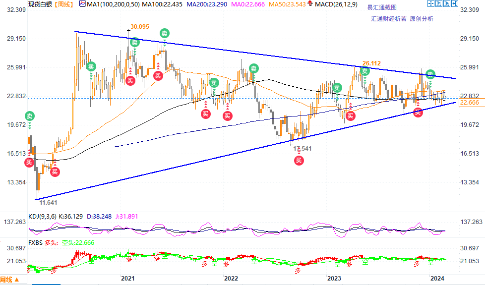 周线级别来看,决定白银价格真正格局走向的恰是周线级别,如下图,自2020年3月底以来,银价最近四年一直处在比较标准的三角形整理形态内,而目前已来到三角形形态的尾端,即将面临“破位”以进行方向性选择。而近期几个月,银价一直处在该三角形的下半部分波动,也是夹在50周均线、100周均线及200周均线内震荡。