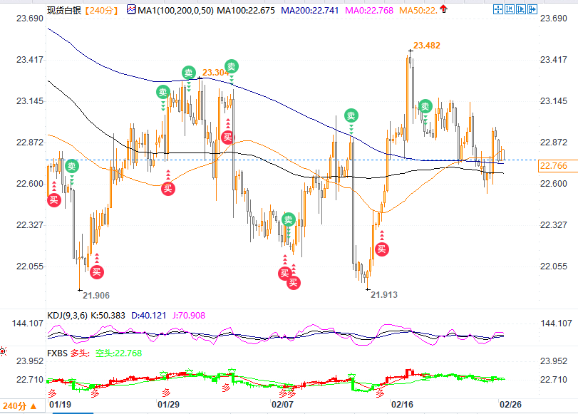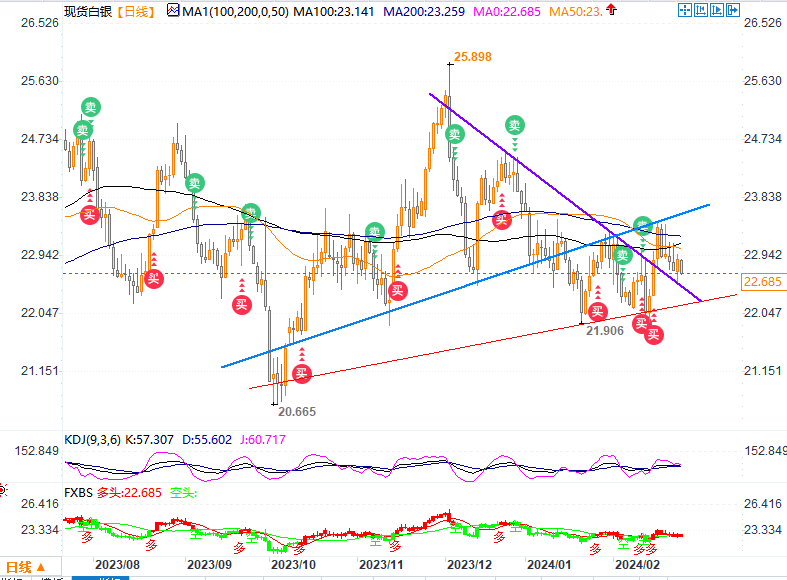 日图来看,白银自2月16日创23.48高位后遇阻下跌,为何下跌呢?日图技术形态显示,这是价格受到前期三角形下轨延伸性压制的结果,不过上周五(2月23日)在触及22.717后反弹并收阳,为2月16日以来的最大涨幅,也正好是受到前期三角形上轨延伸性的支撑,但上方50日、100日及200日均线都在上方压制着价格。日图来看,不排除下探至22.30-22.20区域的可能性。该区域有2023年10月以来低点连线形成的趋势线支撑。若跌至该水平将引发较多买盘入场。