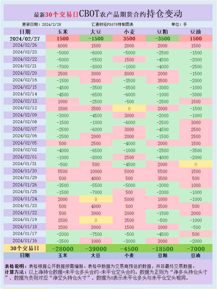 本周二(2月27日),大宗商品基金增加CBOT玉米、豆油、小麦投机性净多头头寸,增加大豆、豆粕投机性净空头头寸。最新30个交易日,大宗商品基金增加CBOT豆粕、大豆、玉米、小麦、豆油投机性净空头头寸。