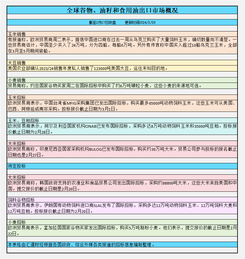 截至周二收盘,全球谷物、油籽和食用油出口市场概况: