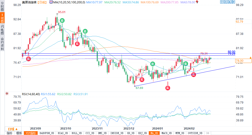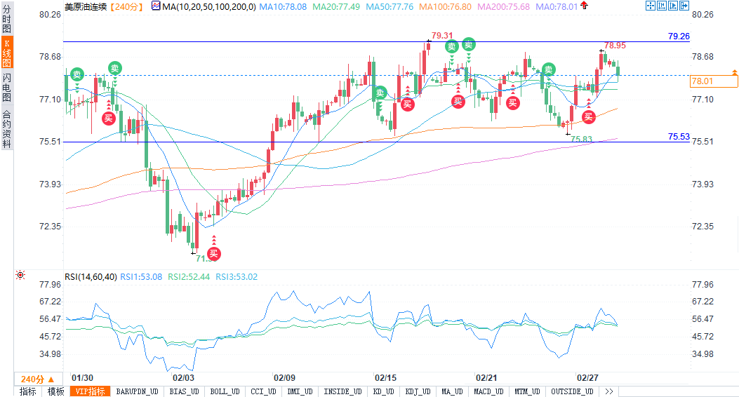 汇通财经APP讯——周三(2月28日),WTI原油从欧盘时段下跌,盘中报77.90美元每桶,跌幅0.79%。