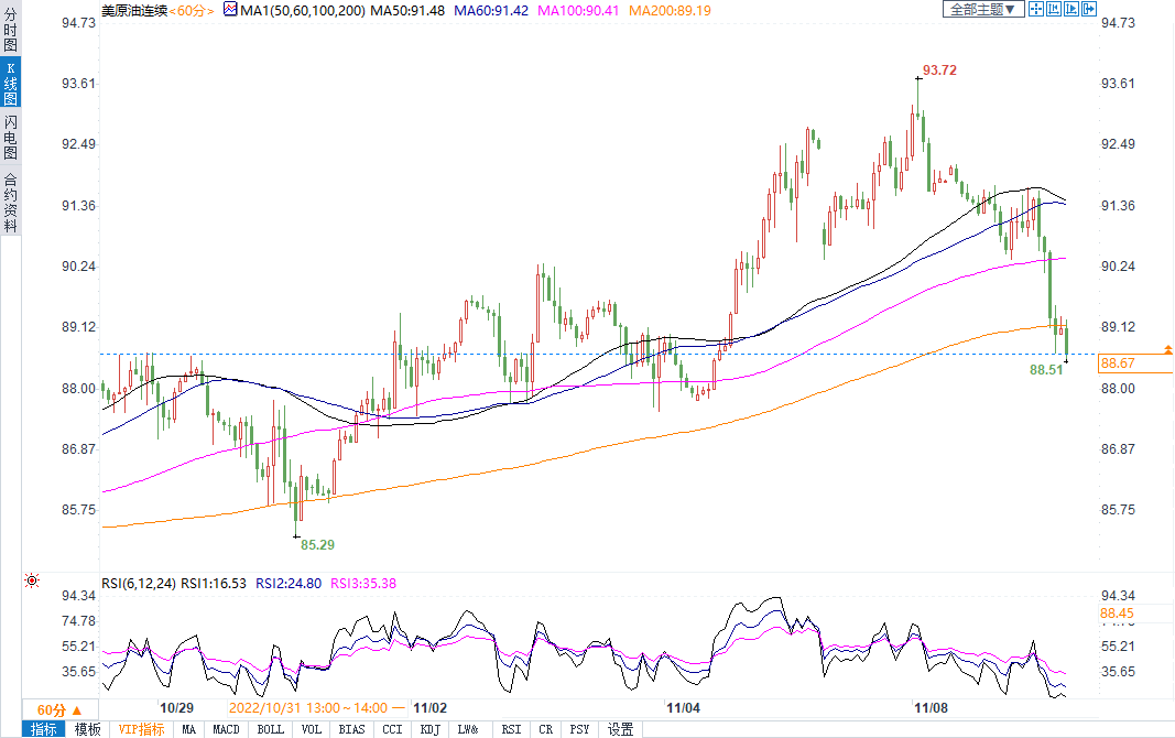 周二(11月8日)布油尾盘下跌2.85%,报收95.13美元/桶。早前被视为美国经济晴雨表的联邦快递因需求下滑,公司已经压缩航班的运营。同时该公司CEO警告称,我们正在进入全球衰退。美国石油协会公布的数据显示,截至11月4日当周,原油库存大增561.8万桶,汽油库存增加255.3万桶,精炼油库存减少177.3万桶。数据公布后油价走低。
