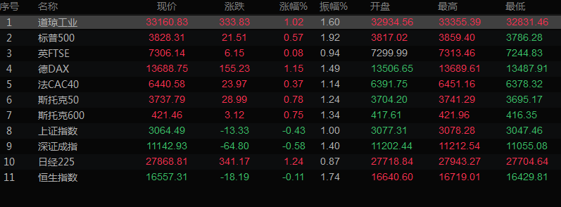 道琼斯工业指数攀升1.02%,至33160.83点。