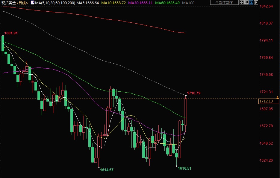 稍早,黄金触及1716.82美元,为10月6日以来最高,自上周创下两个多月低点1615.59美元以来,金价已经上涨超过100美元。纽约Heraeus Precious Metals高级交易员Tai Wong说,“看起来黄金和白银有新买盘。我认为,随着美联储看似将在12月将加息步伐放缓至50个基点,美元正在回落。”