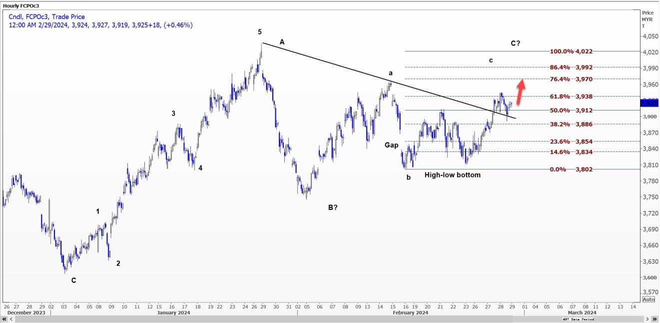 回调也可能朝向高低底部的颈线。跌破3912林吉特将是进一步跌向3854-3886林吉特区间的早期信号。