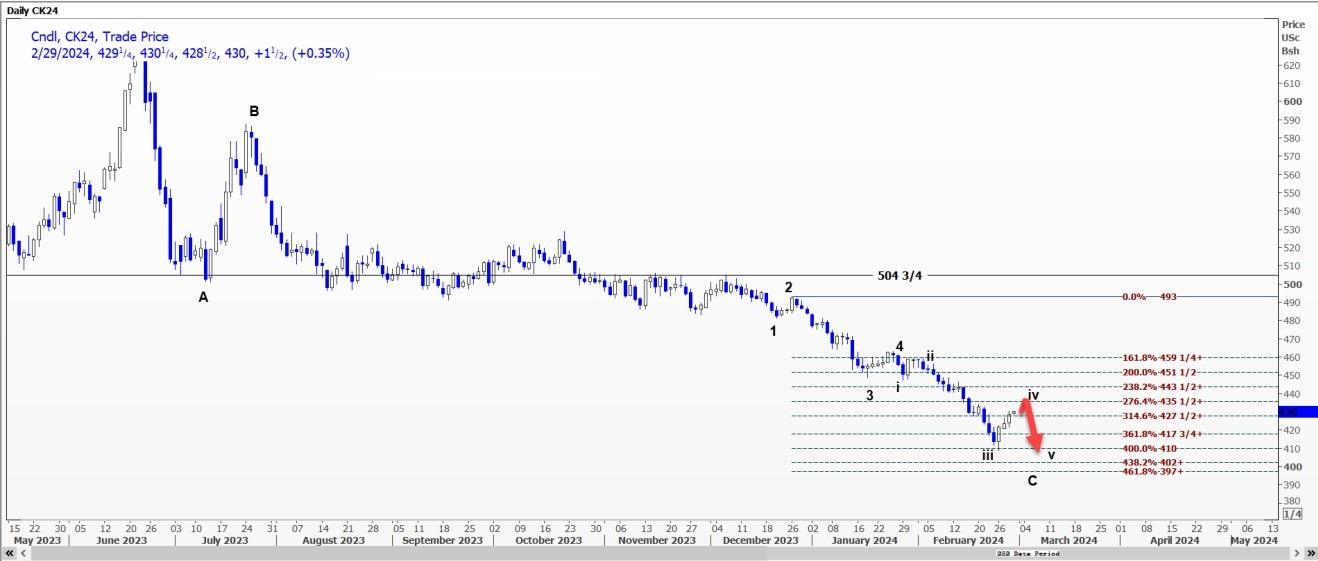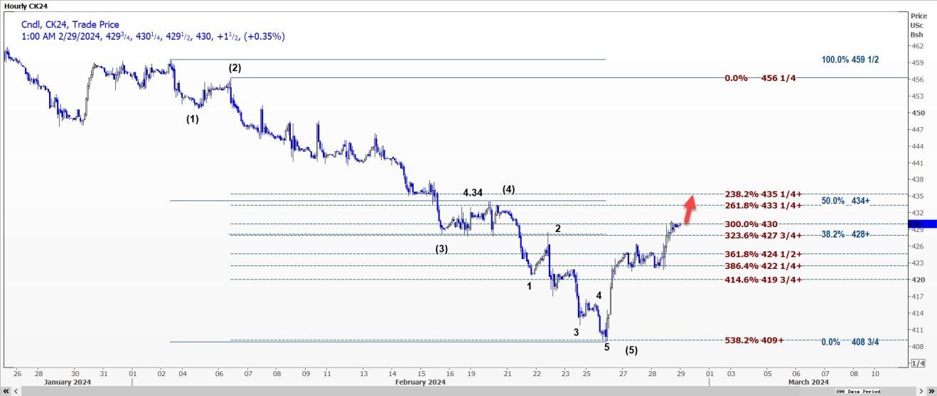 CBOT美玉米CK24可能上涨至每蒲式耳4.3325美元至4.3525美元的区间(第4波浪潮结束时)。